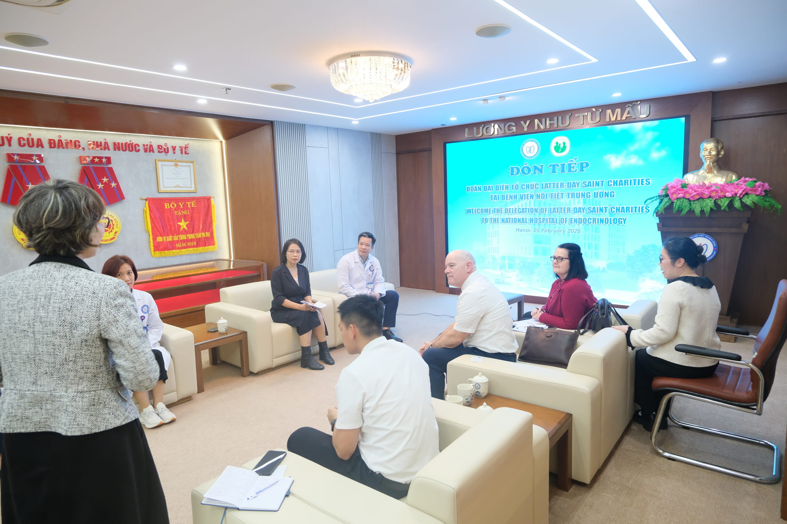 Chiều ngày 05/02/2026, Bệnh viện Nội tiết Trung ương đã có buổi làm việc với đại diện Tổ chức Latter-day Saint Charities (LDSC – Hoa Kỳ) nhằm trao đổi, khảo sát nhu cầu và tình trạng sử dụng xe lăn tại bệnh viện, làm cơ sở xây dựng kế hoạch hợp tác, hỗ trợ trong thời gian tới.