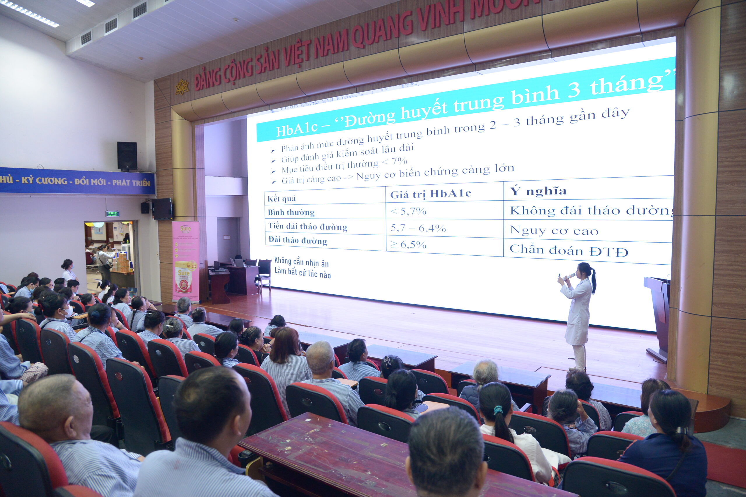 Tiếp nối chương trình, BS. Nguyễn Phùng Hưng – Liên khoa Mắt – RHM – TMH đã trao đổi về cách dự phòng biến chứng mắt cho người bệnh đái tháo đường. Những lời khuyên về cách kiểm soát đường huyết và tầm soát mắt định kỳ được bác sĩ truyền đạt một cách đơn giản, giúp người bệnh biết cách bảo vệ thị lực của mình. Đồng thời, để người bệnh không còn bối rối khi xem kết quả xét nghiệm, ThS. Lê Ngân Hạnh – Khoa Nội chung đã giải thích rõ ý nghĩa của các chỉ số quan trọng. Khi hiểu được các con số này, người bệnh sẽ dễ dàng hơn trong việc điều chỉnh chế độ ăn uống và sinh hoạt hàng ngày.