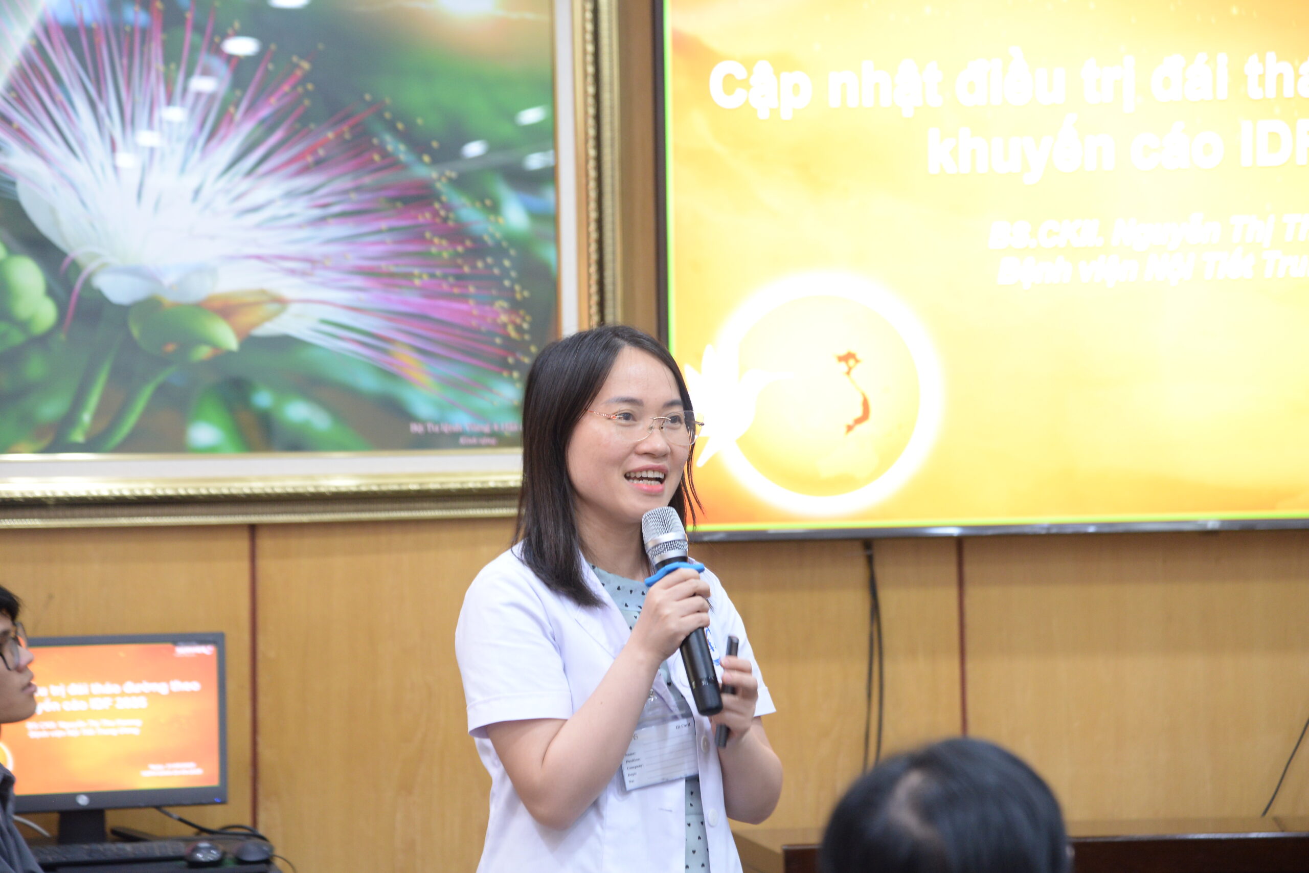 Bài báo cáo đầu tiên do BS.CKII Nguyễn Thị Thu Hương – Phó Trưởng khoa Thận – Tiết niệu, Bệnh viện Nội tiết Trung ương trình bày. Nội dung tập trung vào các điểm mới của khuyến cáo IDF 2025 về chiến lược điều trị toàn diện bệnh nhân đái tháo đường, nhấn mạnh vai trò của việc kiểm soát đường huyết sớm và liên tục, lựa chọn thuốc điều trị dựa trên nguy cơ tim mạch, thận và các bệnh lý kèm theo. Đồng thời, báo cáo cũng cập nhật các chỉ số mục tiêu điều trị và nhấn mạnh yếu tố cá thể hóa trong chăm sóc người bệnh.
