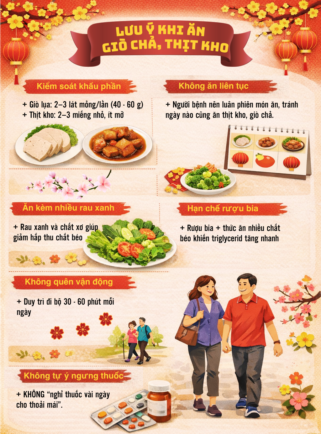Trong mâm cơm ngày Tết của người Việt, giò chả và thịt kho là những món ăn quen thuộc, mang hương vị sum vầy, đoàn viên. Tuy nhiên, với người đang mắc rối loạn mỡ máu, đái tháo đường hoặc các bệnh lý chuyển hóa, việc sử dụng các món ăn này sao cho hợp lý là điều không ít người băn khoăn.