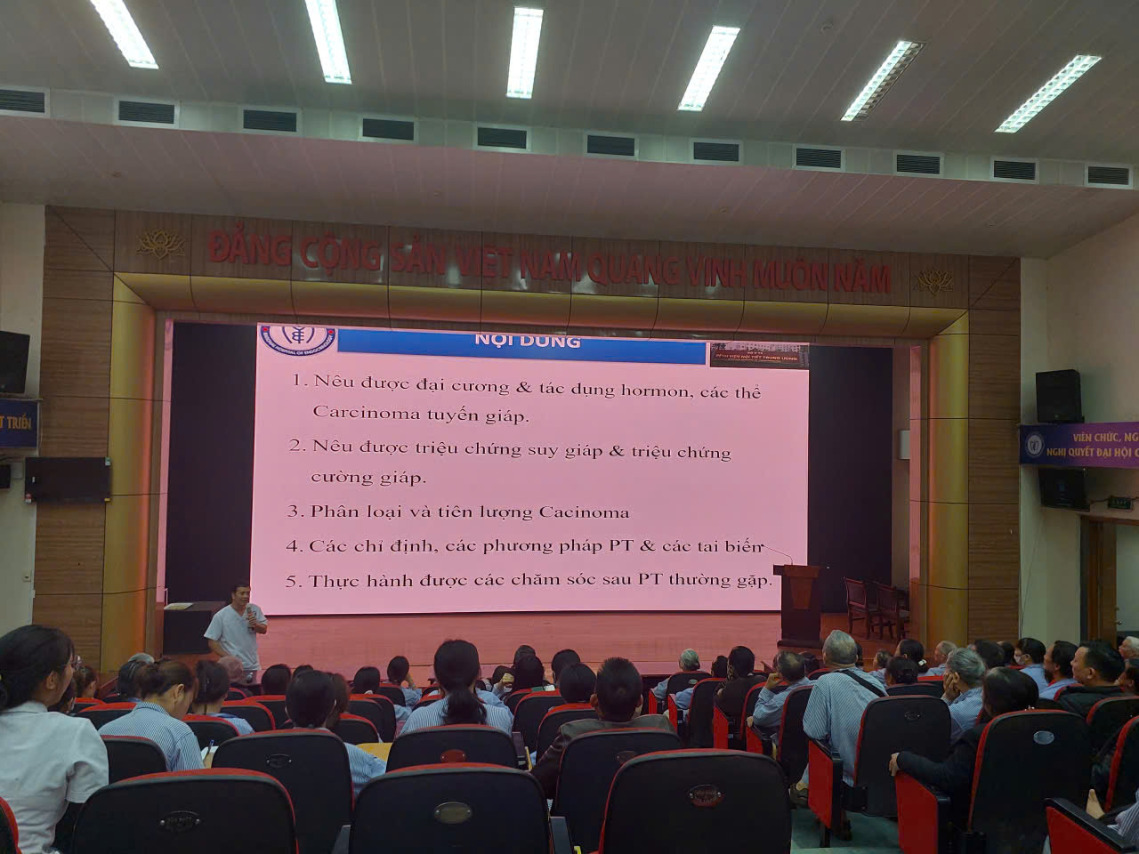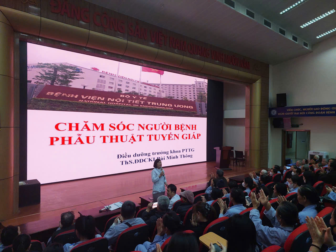 Mở đầu buổi giáo dục sức khỏe ThS.ĐD Bùi Minh Thông, Điều dưỡng Trưởng khoa Phẫu thuật tuyến giáp đã chia sẻ những kiến thức cơ bản về tuyến giáp, nhận biết triệu chứng cường giáp, suy giáp cũng như các dấu hiệu gợi ý ung thư tuyến giáp và phân loại bệnh lý ung thư tuyến giáp. Bên cạnh đó, ThS. Bùi Minh Thông cũng chia sẻ về các phương pháp phẫu thuật tuyến giáp hiện đang áp dụng tại Bệnh viện.