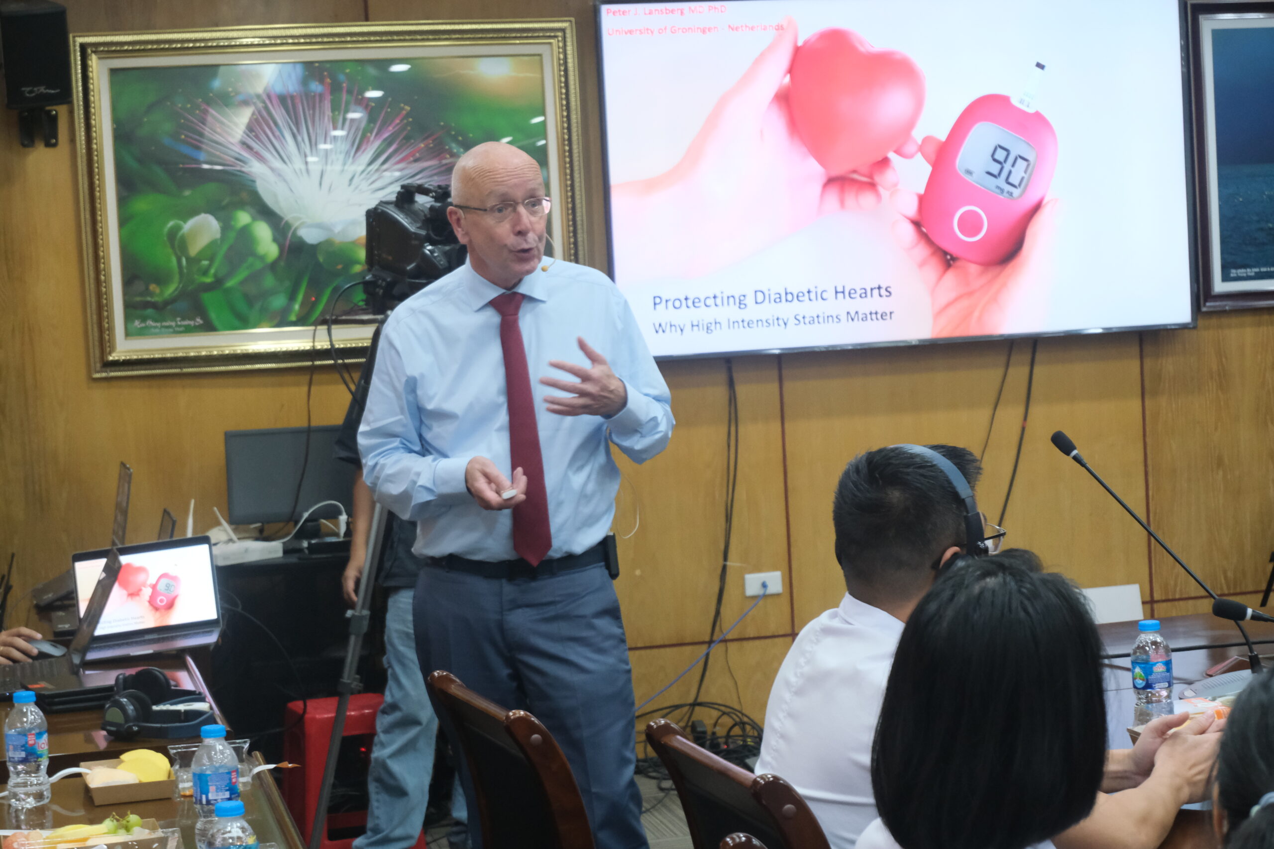 Tiếp nối chương trình, GS. Peter Lansberg báo cáo chuyên đề “Tích cực và chủ động kiểm soát lipid máu trên bệnh nhân đái tháo đường típ 2”. Ông nhấn mạnh, bệnh nhân đái tháo đường thường có nguy cơ cao mắc bệnh lý tim mạch do rối loạn lipid máu. Việc kiểm soát đồng bộ các yếu tố nguy cơ, đặc biệt là điều trị tích cực rối loạn lipid, có ý nghĩa then chốt trong phòng ngừa biến chứng mạch máu lớn. GS. Lansberg đã cập nhật các khuyến cáo quốc tế mới nhất, đồng thời chia sẻ kinh nghiệm lâm sàng về việc lựa chọn và phối hợp các nhóm thuốc hạ lipid máu nhằm đạt mục tiêu kiểm soát tối ưu, giảm thiểu rủi ro cho người bệnh.