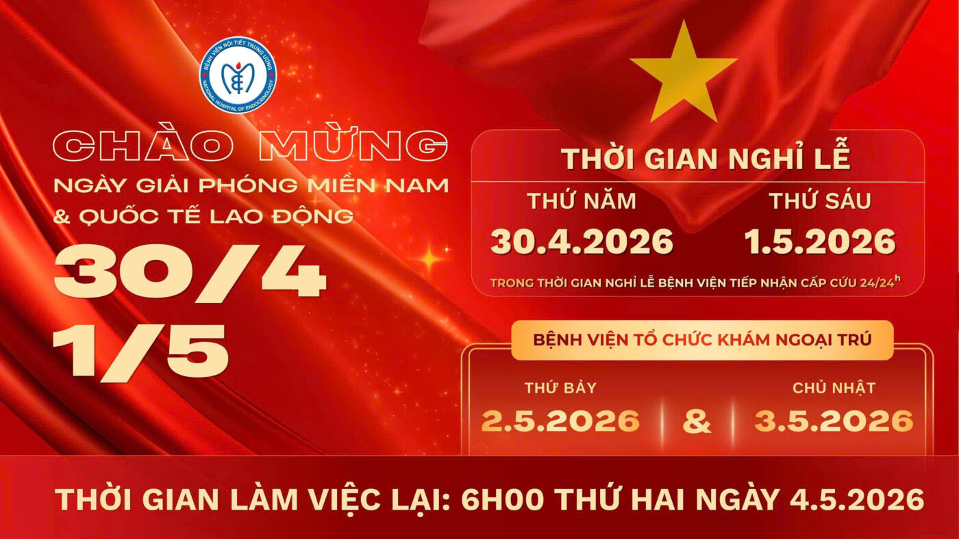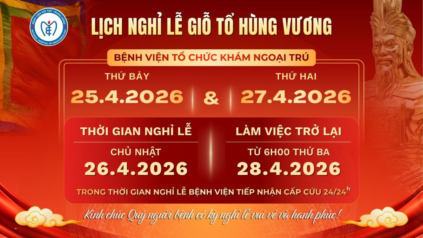 Thực hiện theo Bộ Luật Lao động 2019 và Chỉ đạo của Thủ tướng Chính phủ về việc nghỉ lễ Giỗ Tổ Hùng Vương năm 2026; nghỉ lễ 30/4 và 01/5 năm 2026. Bệnh viện Nội tiết Trung ương xin thông báo lịch khám bệnh dịp nghỉ Lễ như sau:
